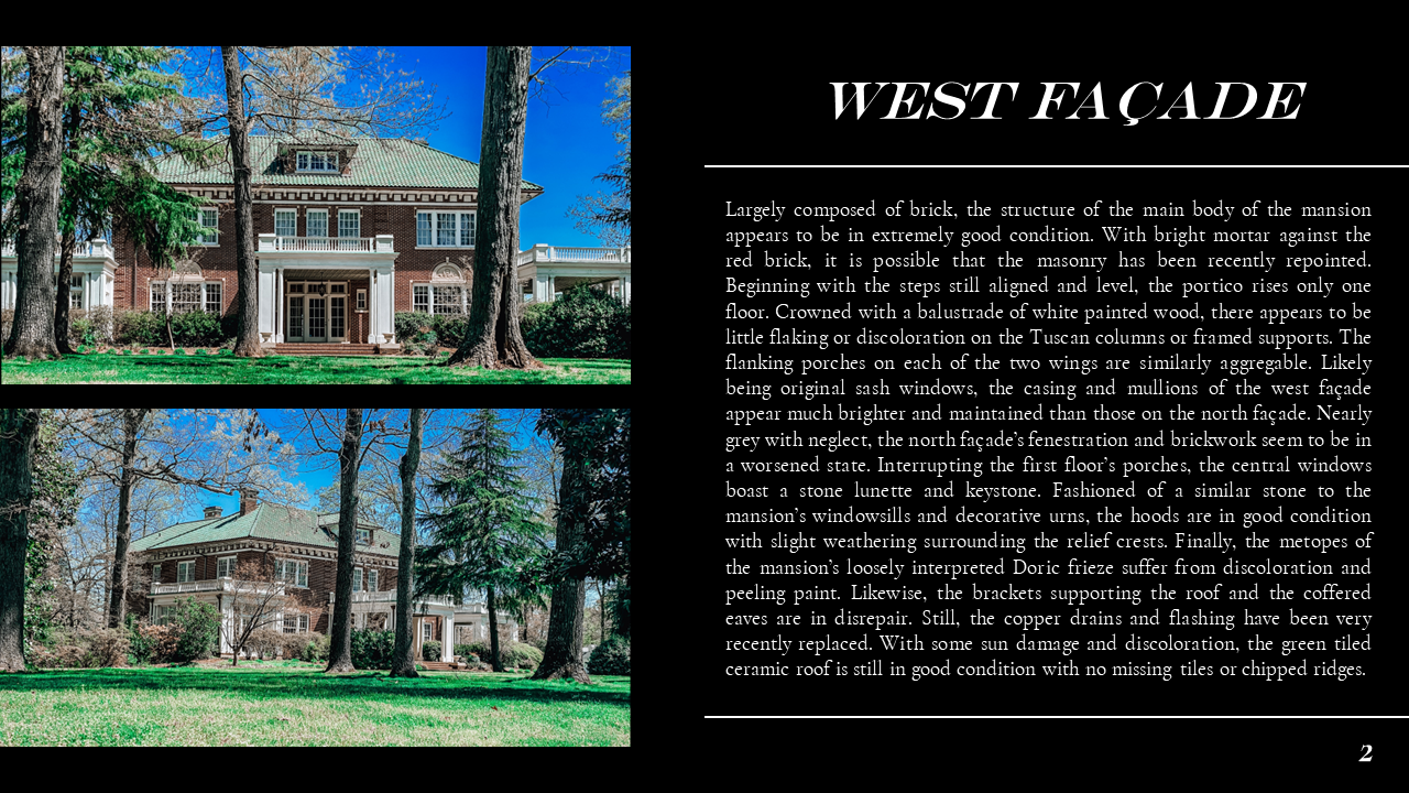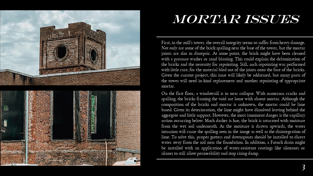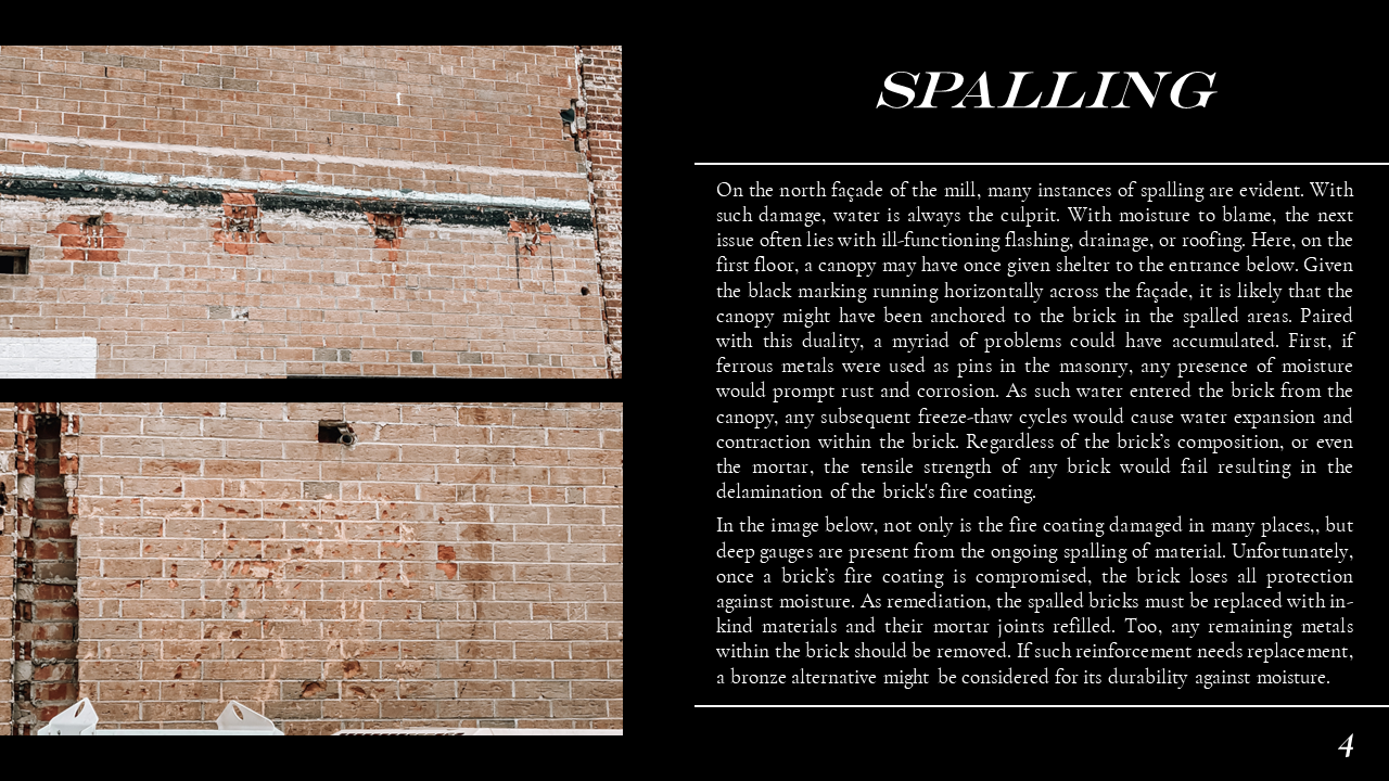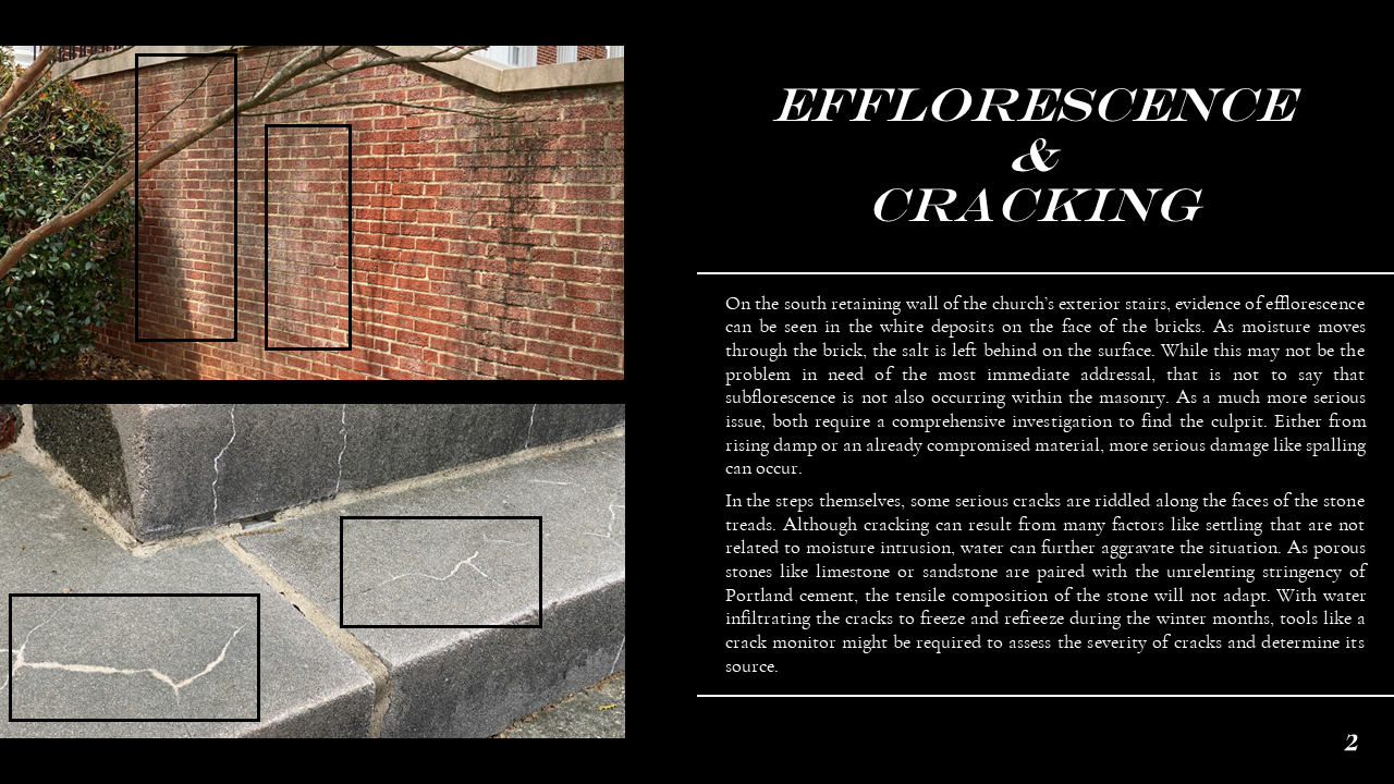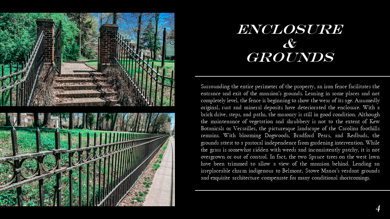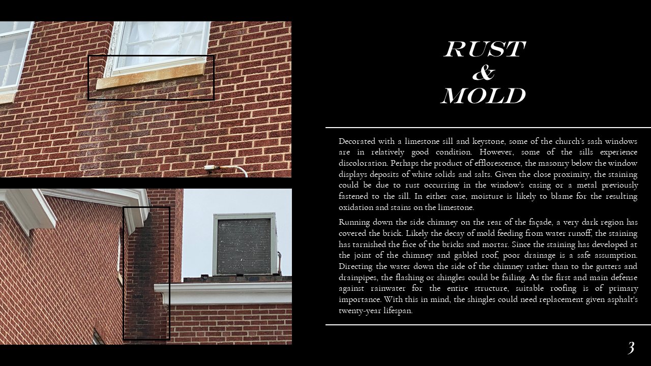 The Belmont Historic District Condition Assessments were conducted during Dillon's Conservation Science studio. In the studio, Dillon ventured into the field to document historic building materials, identify areas of deterioration, and conservation remediation. Part of this research also included documenting the site through architectural descriptions and photographs, as well as providing a history of the site. Through his condition assessments, Dillon developed skills for recognizing the fabric and integrity of construction materiality and exercised his use of preservation and sustainability best practices prescribed by the Secretary of the Interior and LEED. Part of Dillon's passion for preservation comes from the tangible historic fabric that makes up the built environment, and this work exemplifies the granular qualities of architecture that constitute communities' sense of place. Please scroll down to Condition Assessments for General Building Survey, Moisture Damage, Stone Damage, Brick Masonry, and Historic Metalwork.