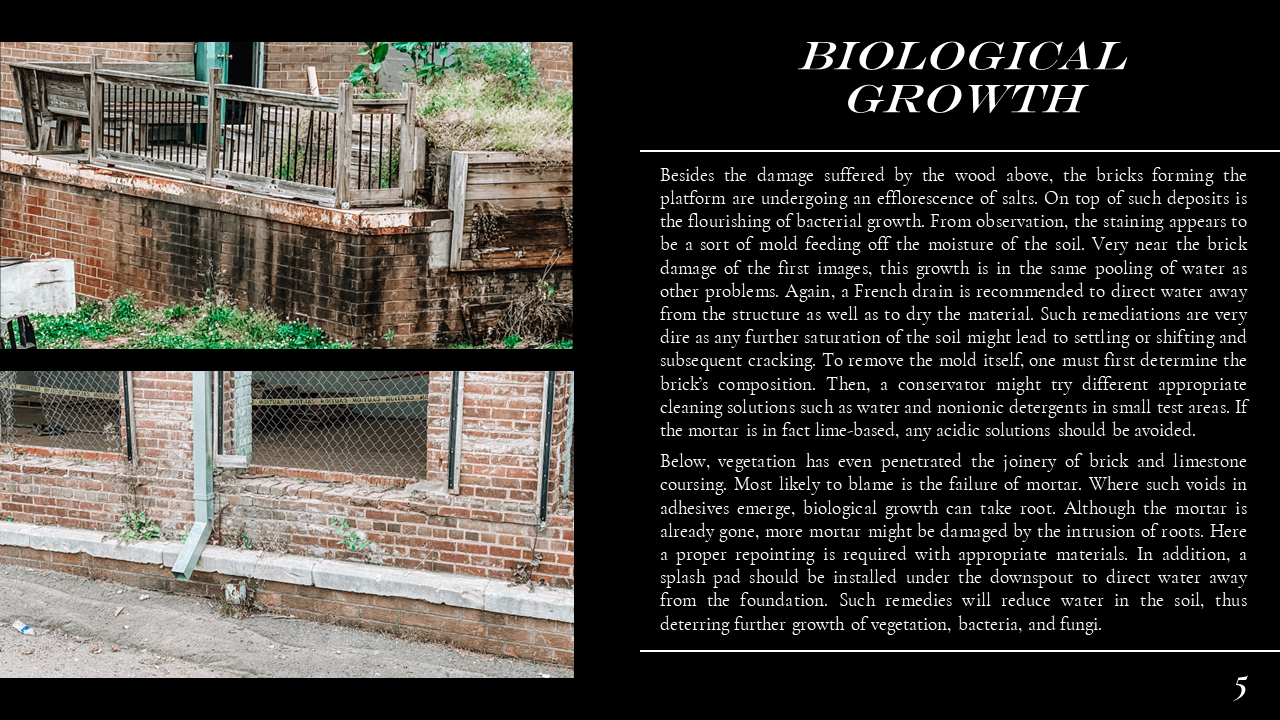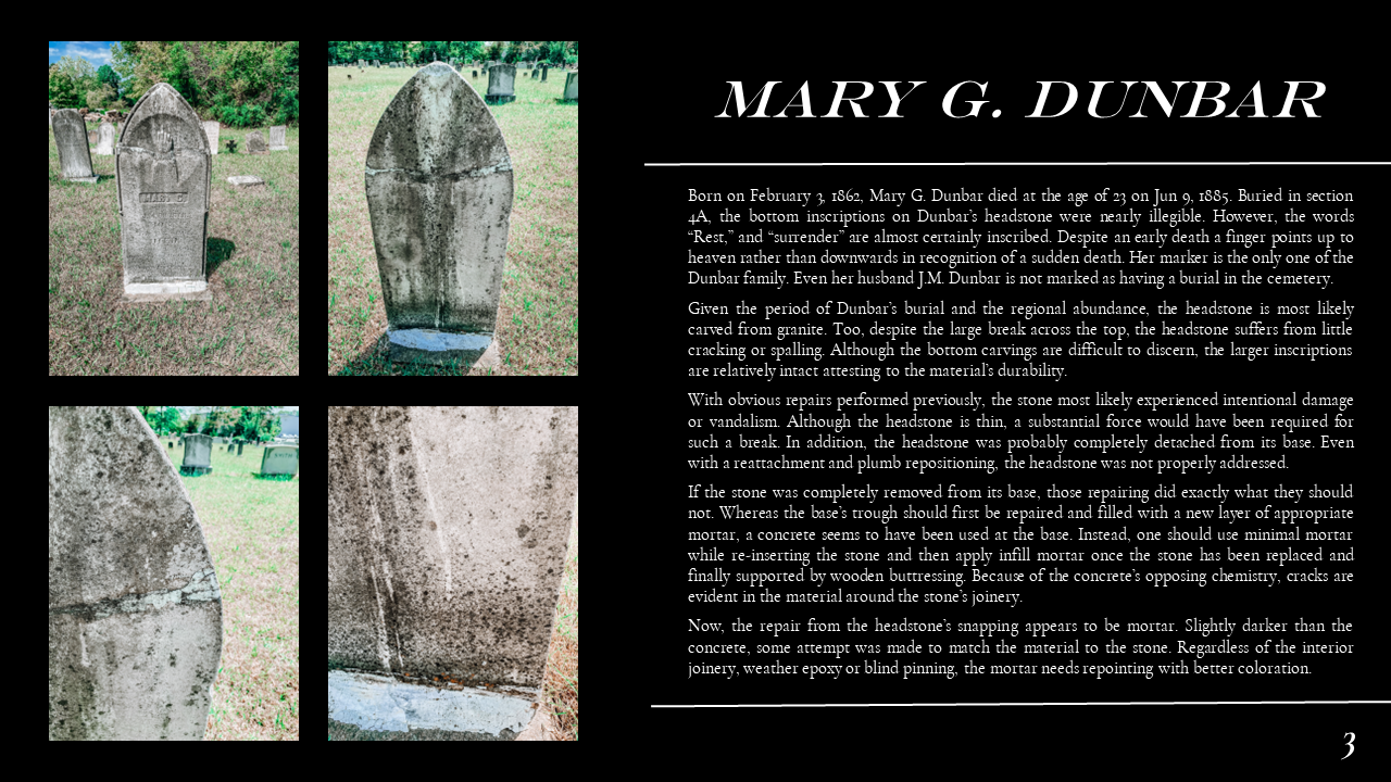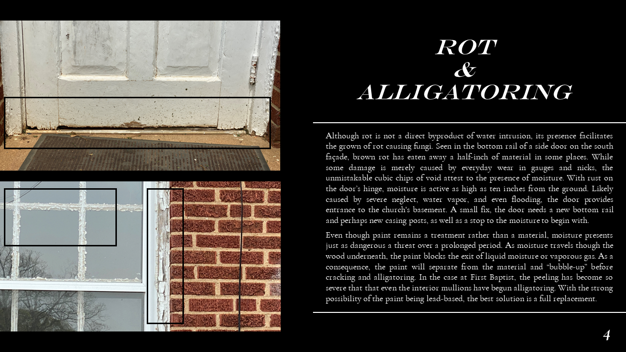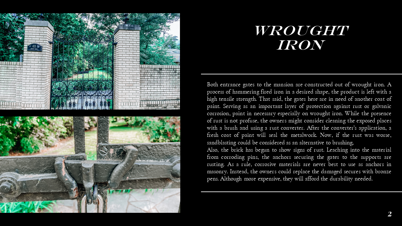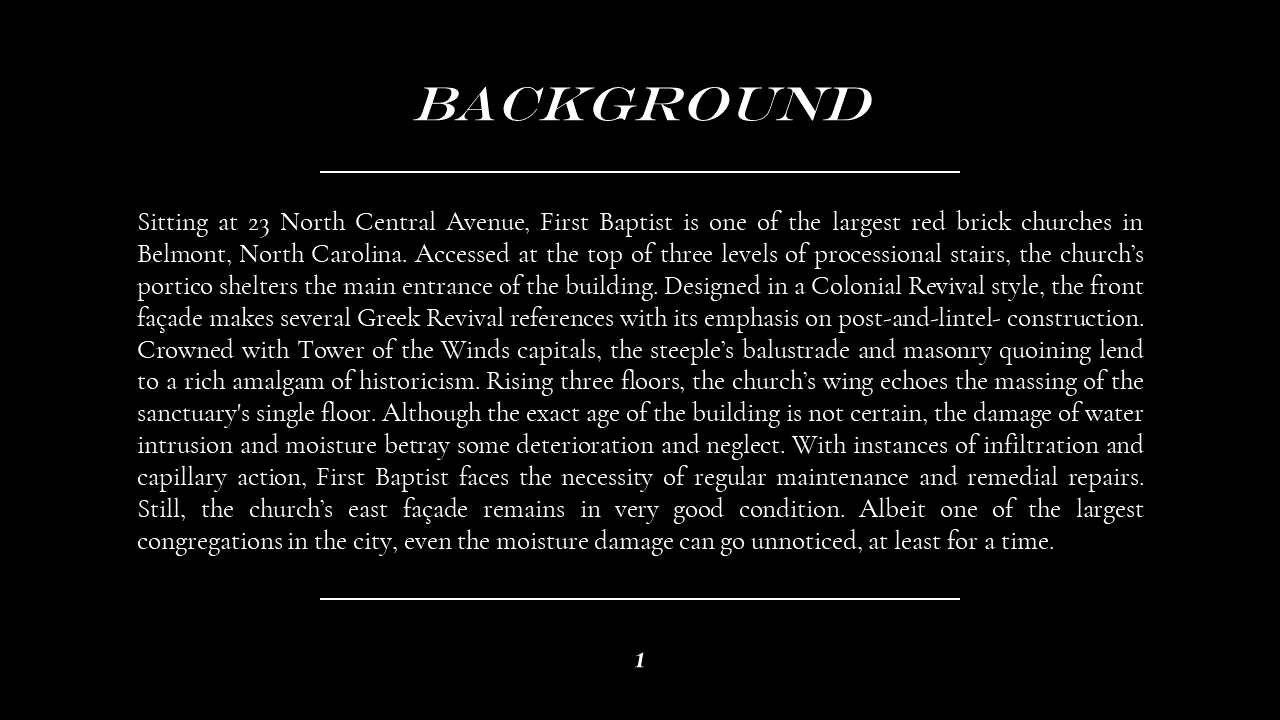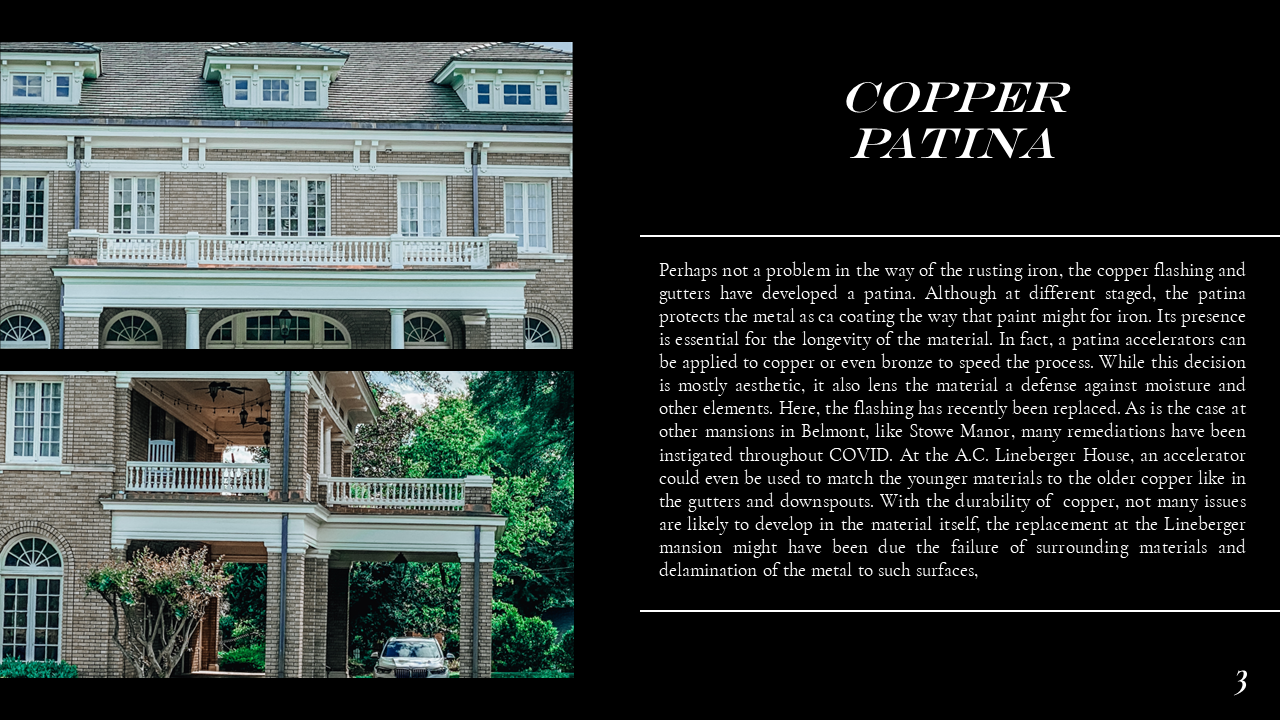 The Belmont Historic District Condition Assessments were conducted during Dillon's Conservation Science studio. In the studio, Dillon ventured into the field to document historic building materials, identify areas of deterioration, and conservation remediation. Part of this research also included documenting the site through architectural descriptions and photographs, as well as providing a history of the site. Through his condition assessments, Dillon developed skills for recognizing the fabric and integrity of construction materiality and exercised his use of preservation and sustainability best practices prescribed by the Secretary of the Interior and LEED. Part of Dillon's passion for preservation comes from the tangible historic fabric that makes up the built environment, and this work exemplifies the granular qualities of architecture that constitute communities' sense of place. Please scroll down to Condition Assessments for General Building Survey, Moisture Damage, Stone Damage, Brick Masonry, and Historic Metalwork.